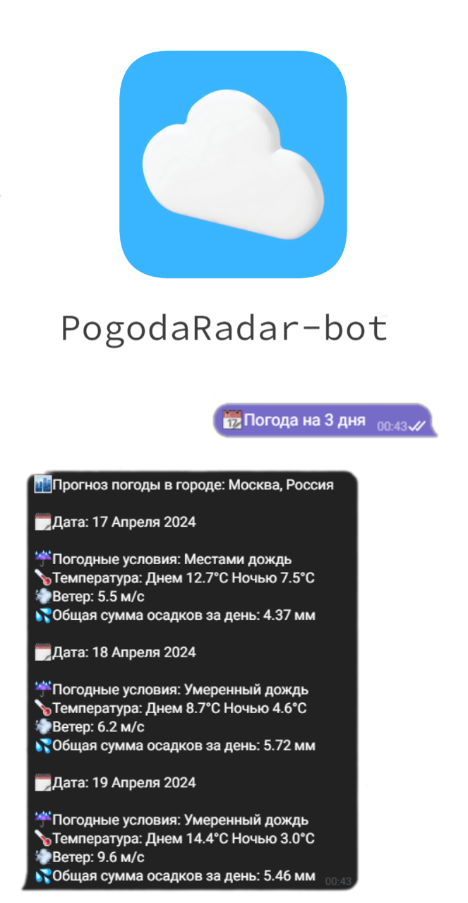 С нашим telegram-ботом вам не стоит бояться что вы попадете в дождь или грозу. Достаточно открыть приложение Telegram под управлением мобильных устройств или web-версию Telegram на компьютере и получать самую актуальную информацию о погоде в вашем местоположении.